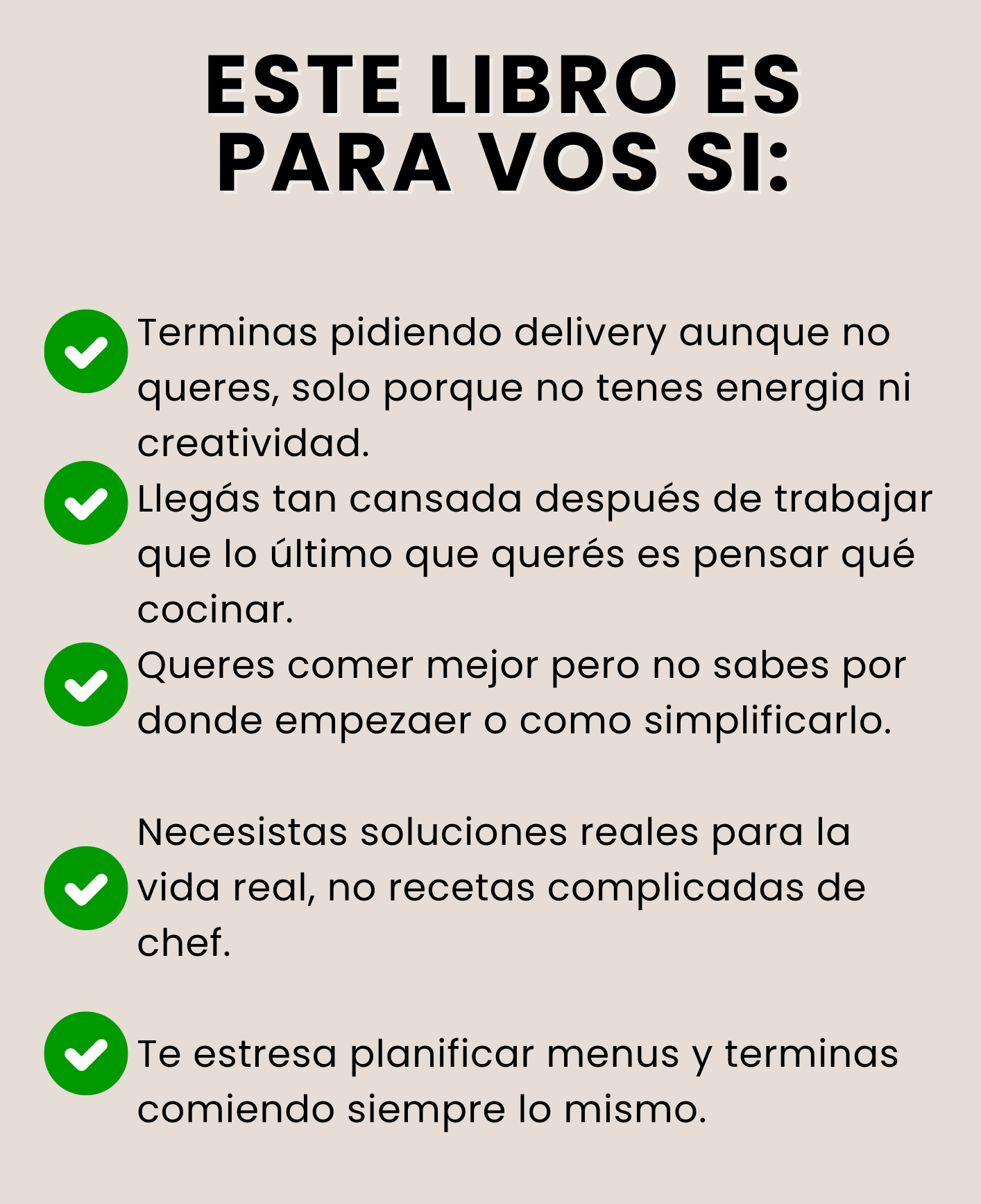Si este ebook no te ayuda a resolver qué comer sin estrés, a ahorrar tiempo en la cocina o a sentirte más tranquilo/a con tus comidas del día a día, podés pedir la devolución del 100% de tu dinero.